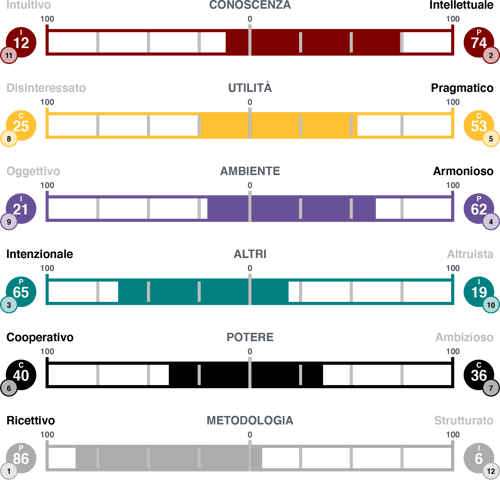 L’analisi Driving Forces indaga le spinte motivazionali delle persone in relazione a: Conoscenza, Utilità, Ambiente, Altri, Potere e Metodologia. Tenendo conto del fatto che ogni motivazione si sviluppa lungo un continuum che dà origine a due forze opposte, l’analisi Driving Forces identifica 12 forze motivazionali, restituendo un quadro completo delle motivazioni personali. Di queste 4 sono le spinte primarie, quelle che guidano la persona quotidianamente, e le altre che influenzano il comportamento in modo più contingente o irrilevante.